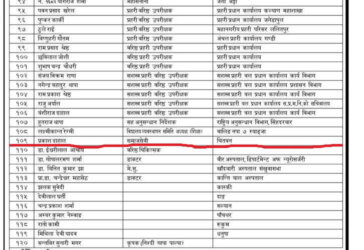 प्रधानमन्त्री पुत्र प्रकाशले समाजसेवीका रुपमा उक्त पदक पाउने भएका हुन् । सुप्रवल जनसेवाश्री पाउनेको सूचीमा १०९औँ नम्बरमा प्रकाशको नाम उल्लेख छ ।
