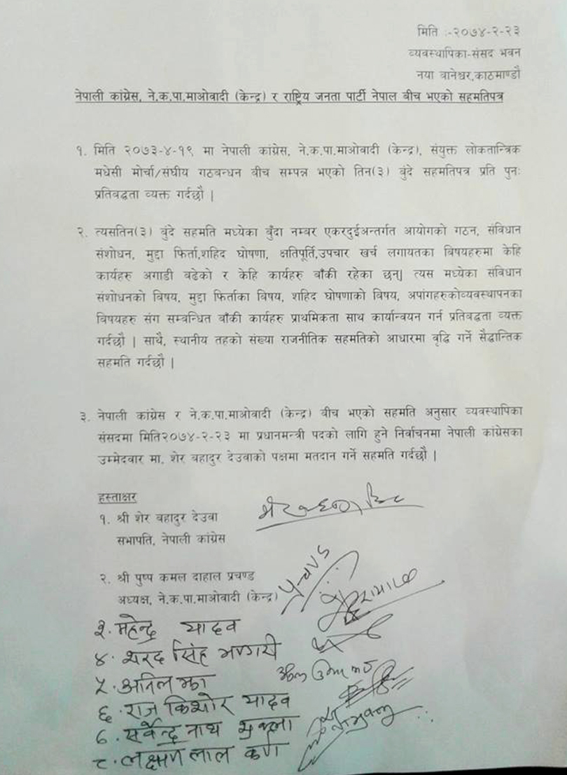 सहमतिमा कांग्रेसका तर्फबाट शेरबहादुर देउवा र माओवादीका अध्यक्ष प्रचण्डले हस्ताक्षर गरेका छन् ।