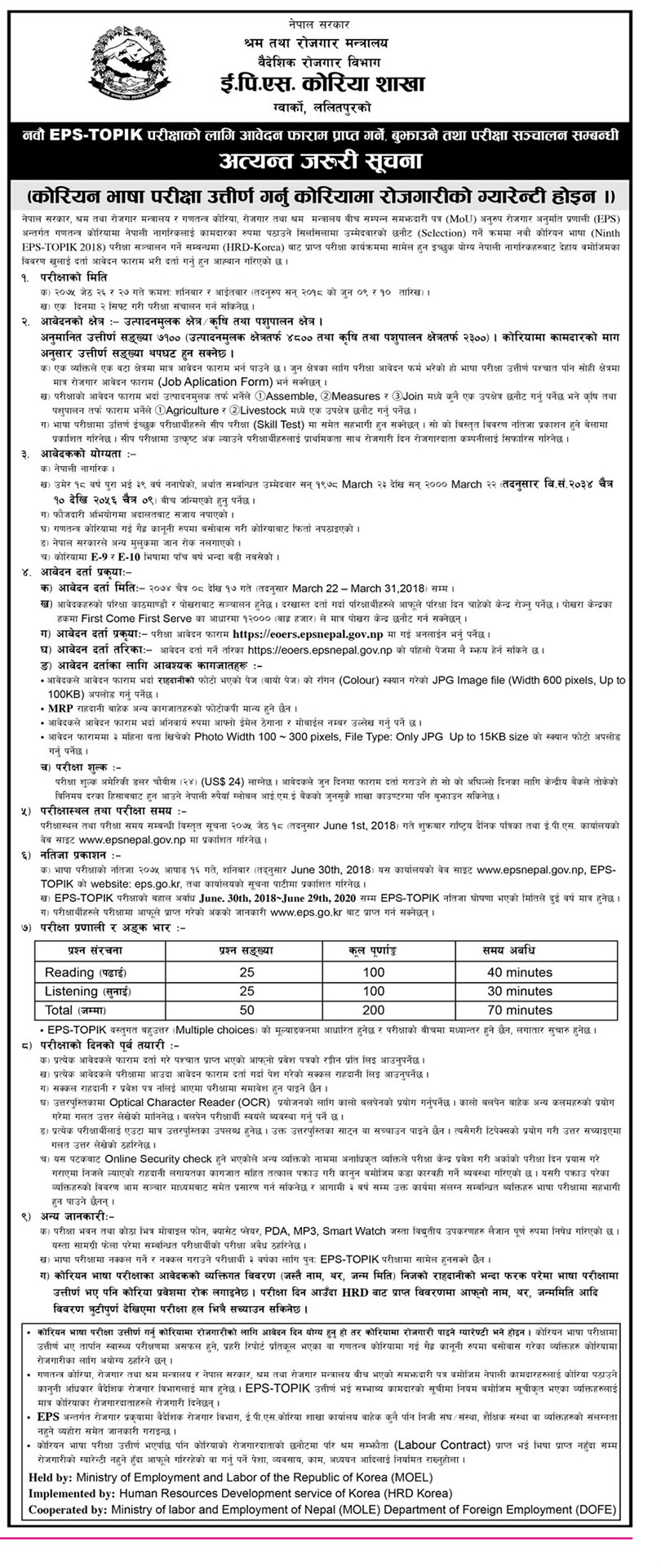 काठमाडौं । कोरियामा रोजगारीका लागि जान चाहनेका लागि भोलि बिहीबारबाट रोजगार अनुमति प्रणाली (ईपीसएस) परीक्षाको आवेदन खुल्ने भएको छ ।