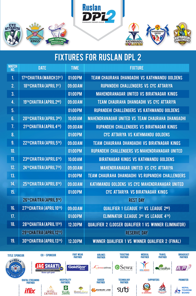प्रतियोगितामा २५ गतेसम्म लिग चरणको खेल हुनेछ भने २७ र २८ गते क्वालिफायर चरणका खेल हुनेछ । त्यस्तै चैत ३० गते फाइनल खेल हुनेछ ।